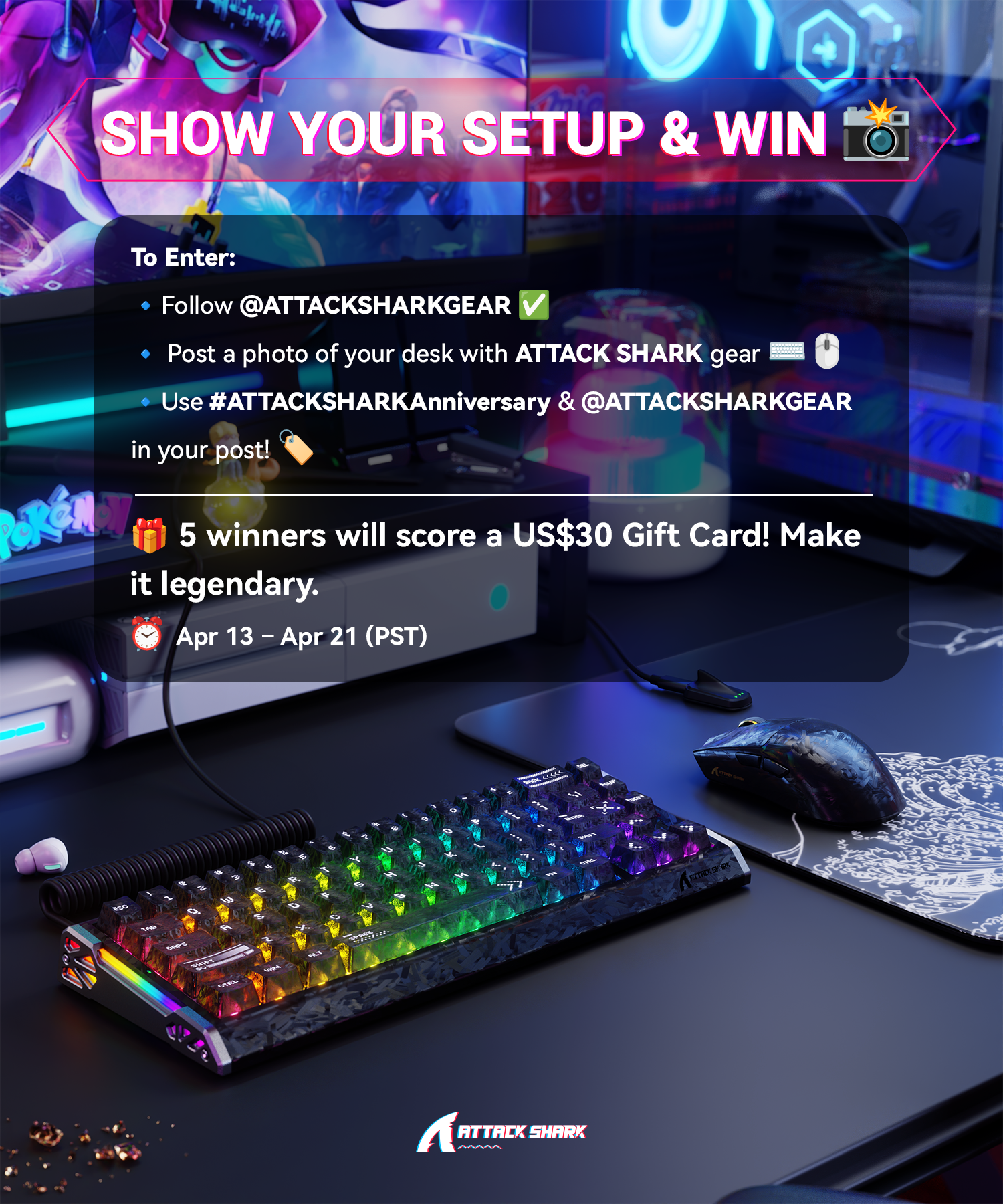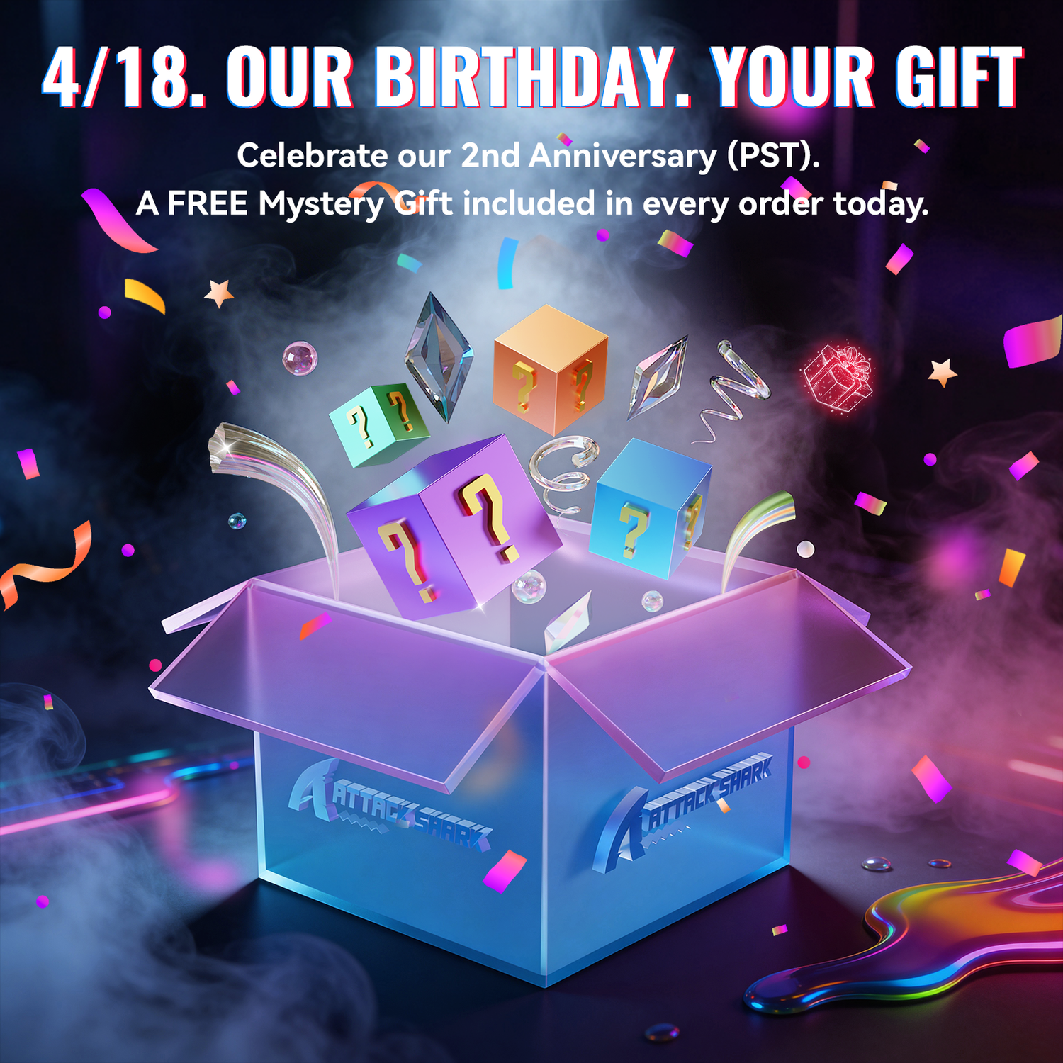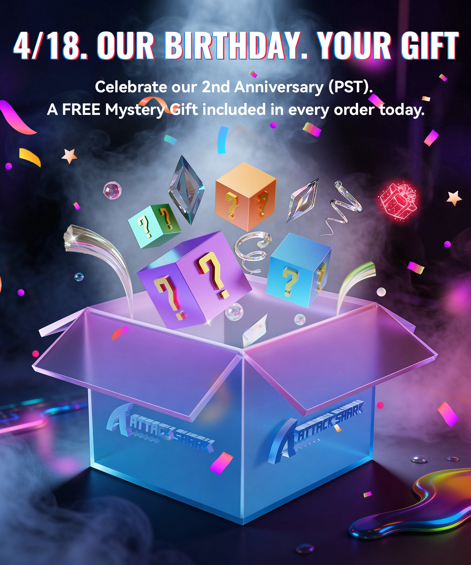 April 18th is our official anniversary. To mark the occasion, every order placed during this 24-hour window (PST) will ship with a Mystery Gift. We’ve pulled a selection of exclusive items and gear essentials from our vault—unbox a piece of ATTACK SHARK history with your new setup.
