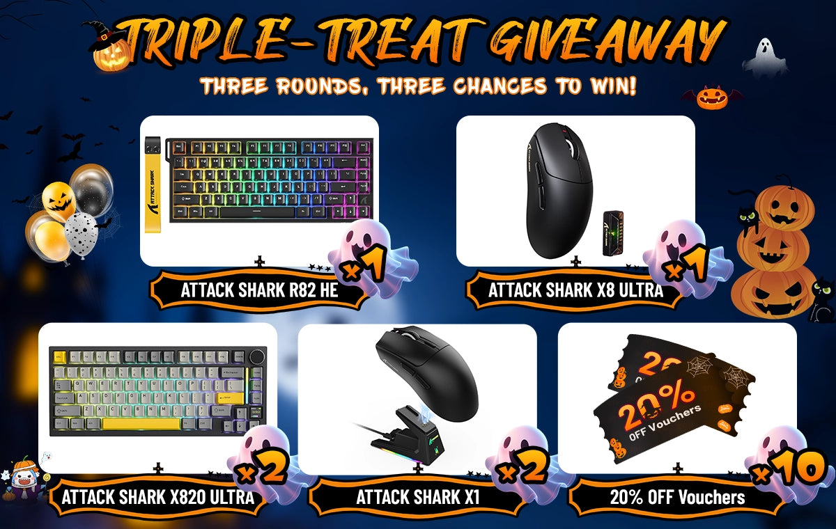 Our Halloween event comes with triple the fun — and triple the prizes! Join all three rounds for your chance to score limited-edition gear and wickedly cool rewards from ATTACK SHARK.