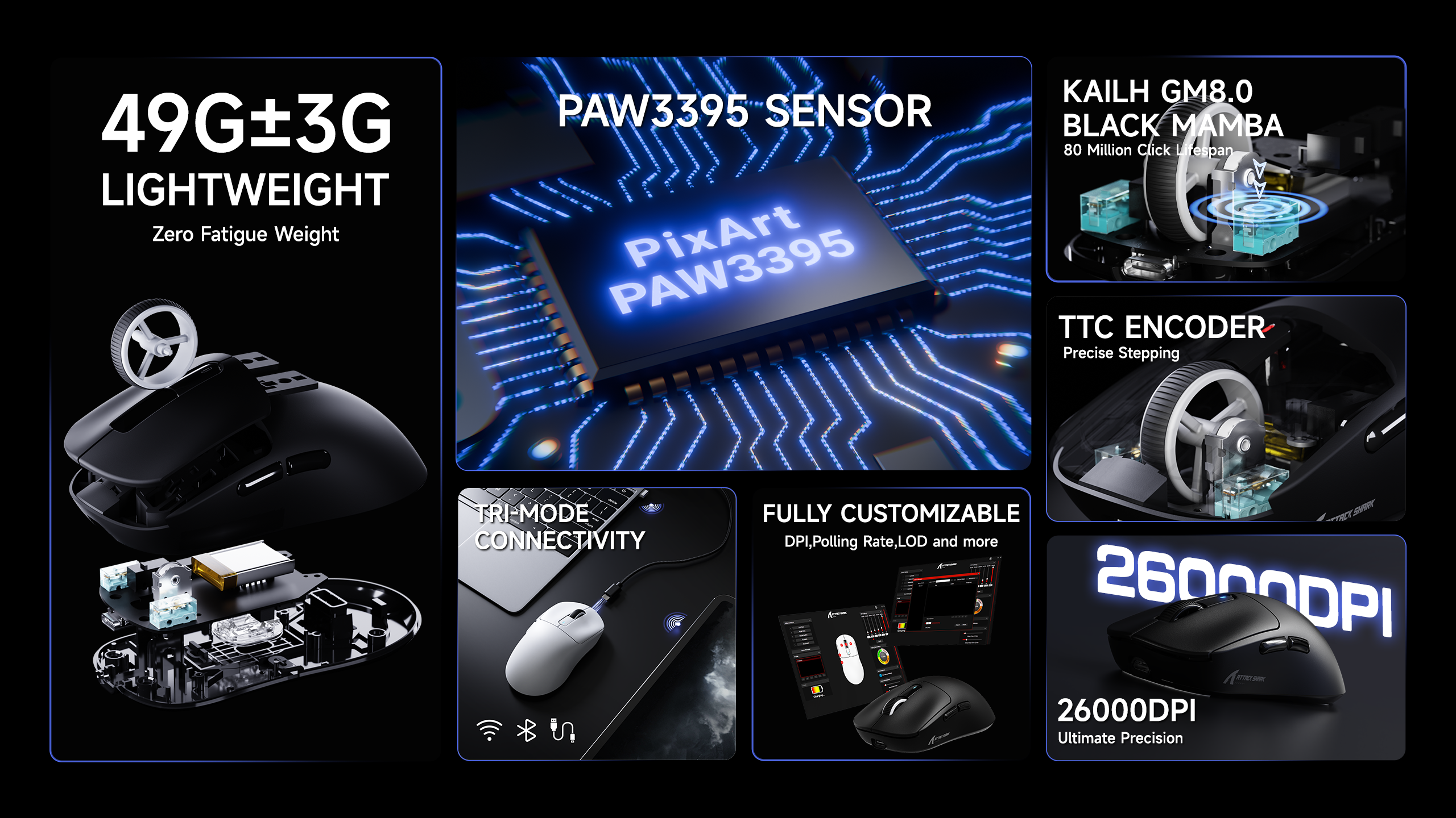 49g SUPERLIGHT, PixArt PAW3395 Gaming Sensor, BT/2.4G Wireless/Wired, 6 Adjustable DPI up to 26000, 200 hrs Battery